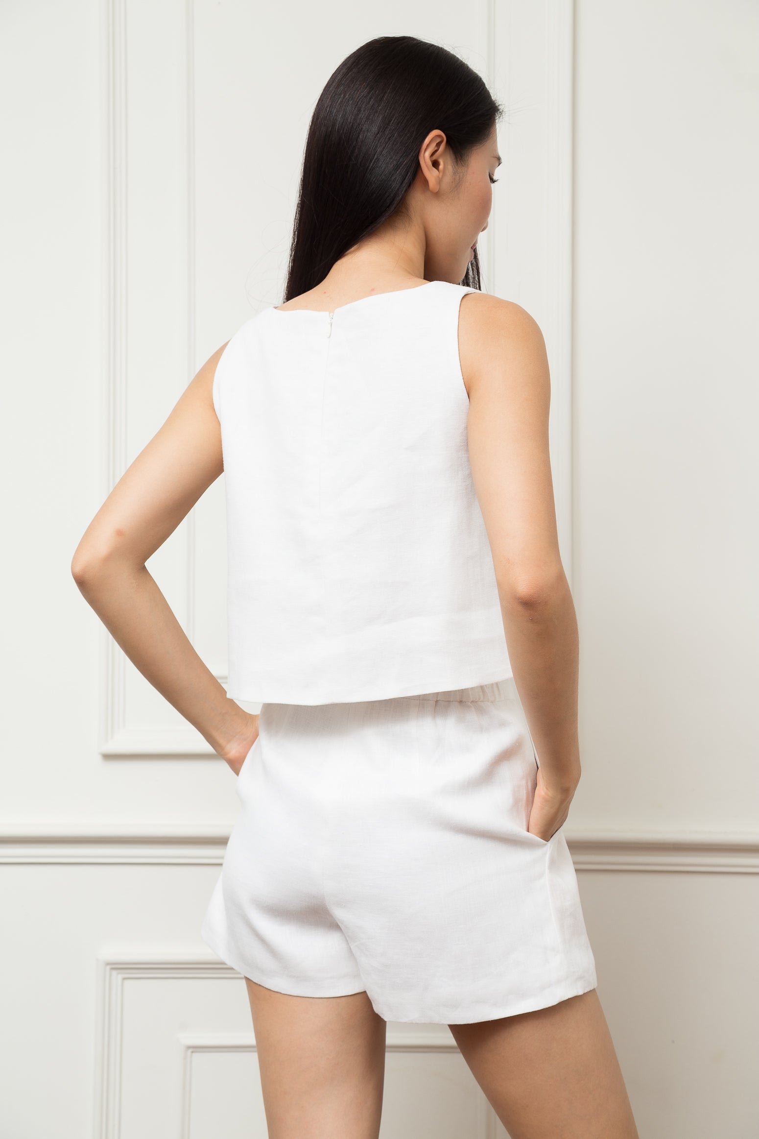 Embrace effortless summer elegance. Our breathable linen crop top, designed to sit just above the belly, offers a casual yet polished look for sun-drenched days.