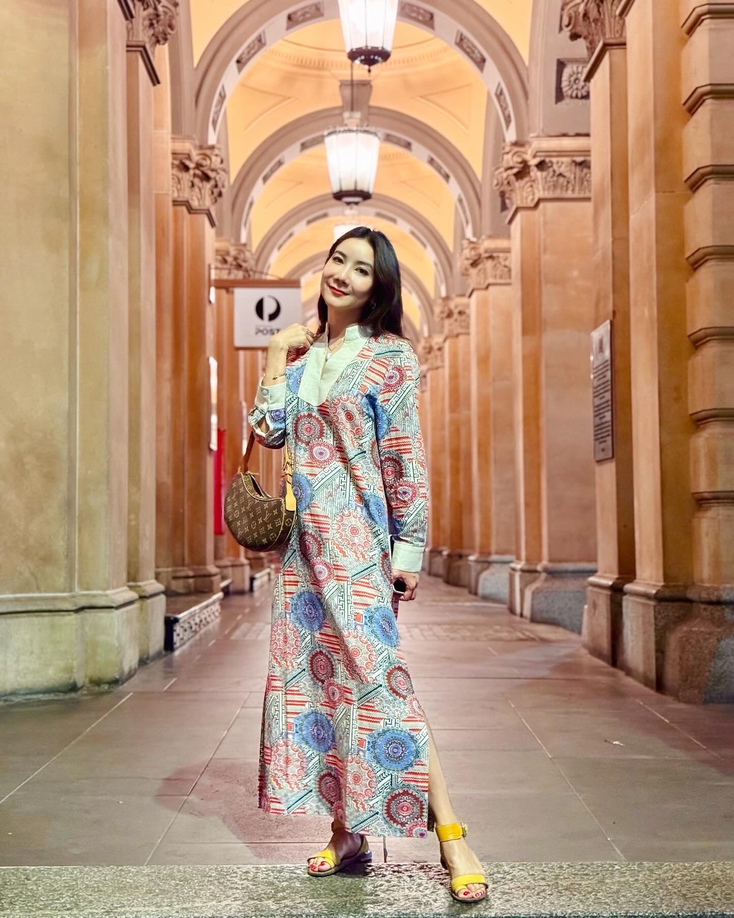 A blend of classic charm and modern elegance. This midi-length linen dress features a mandarin collar, long sleeves, and the exquisite Shanghai print.